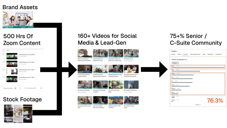 Atomized sessions, trained custom LLM for semantic retrieval; automated clipping & distribution; feedback loop tied to sales.
